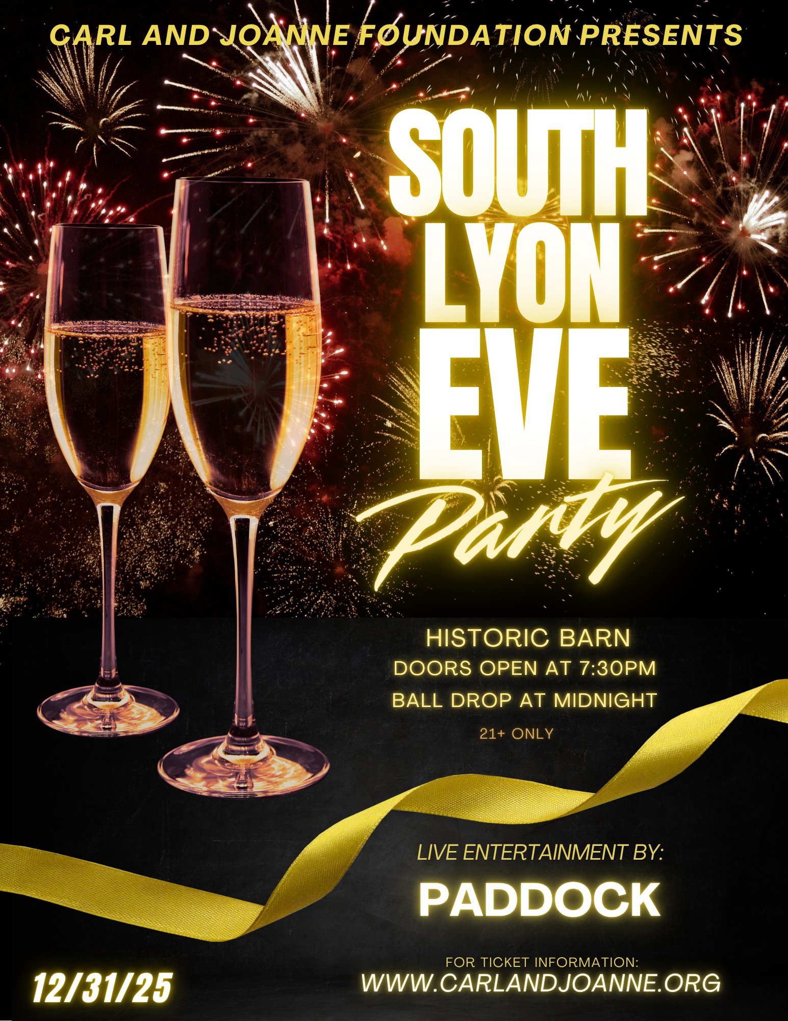 Ring in the New Year with The Carl & Joanne Foundation and the magnificent ball drop for South Lyon (New Year’s) Eve party! This is an indoor/outdoor event. Space is strictly limited and is not guaranteed.